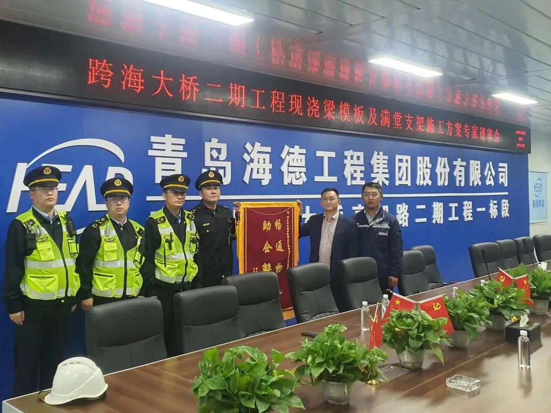 鲁网11月16日讯 近日,青岛市交通重点交通工程跨海大桥高架路二期工程施工项目部负责人向青岛市交通运输综合行政执法支队执法人员赠送了一面锦旗,上面写着“畅通物流,助企解困”字样,高度赞赏并衷心感谢执法人员既执法又服务,为跨海大桥二期高架路建设做出的贡献。