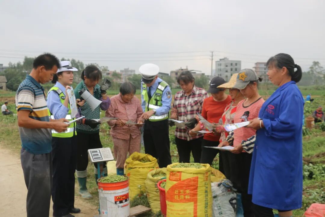 △ 11月17日,广西壮族自治区博白县公安局交管大队民警辅警深入毛豆采收基地,向群众普及交通安全法律法规知识。朱晓波 摄